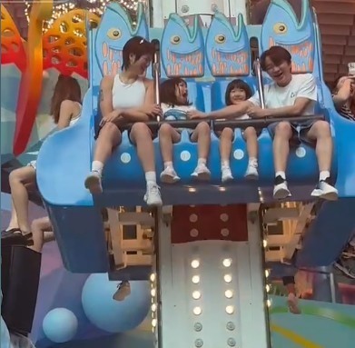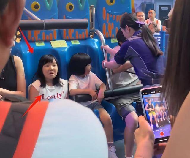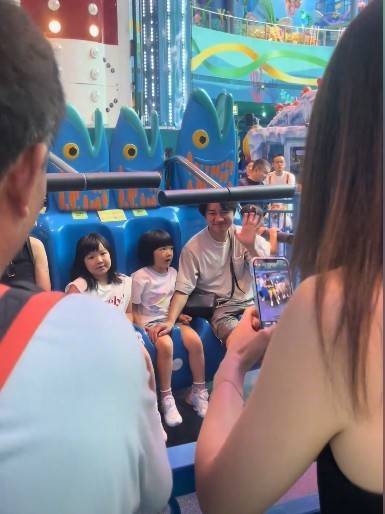 只见画面中王祖蓝带着两个女儿玩小型跳楼机,大概是李亚男个子超过限制的缘故,所以并没有陪孩子们上去,而是在下面给孩子拍照片。